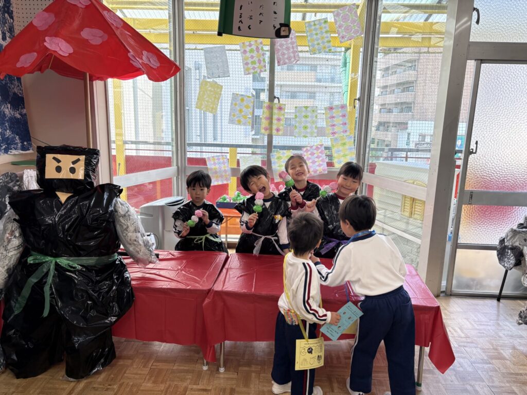 忍術学園に入学!隠れ蓑術や手裏剣投げなどを体験した後は、元気いっぱいの忍者からおいしい三色団子をいただきました🍡♪