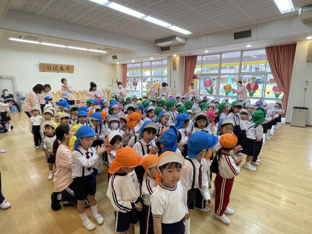 遊戯室に全園児が集まり、はじめましての会を行いました!!